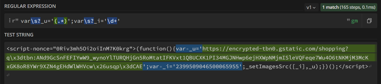 Вот пример регулярного выражения для извлечения URL-адреса изображения и его идентификатора из тегов <script>: