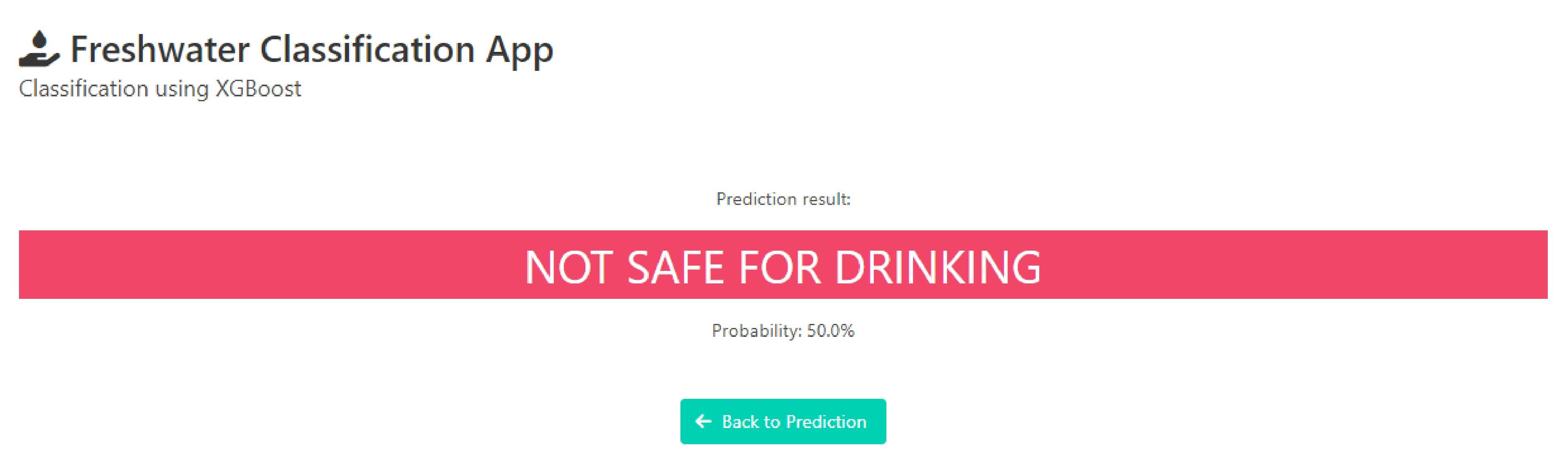 Прогноз будет показан на следующей странице, безопасно ли это для питья. Вероятность также будет показана под результатом прогноза.