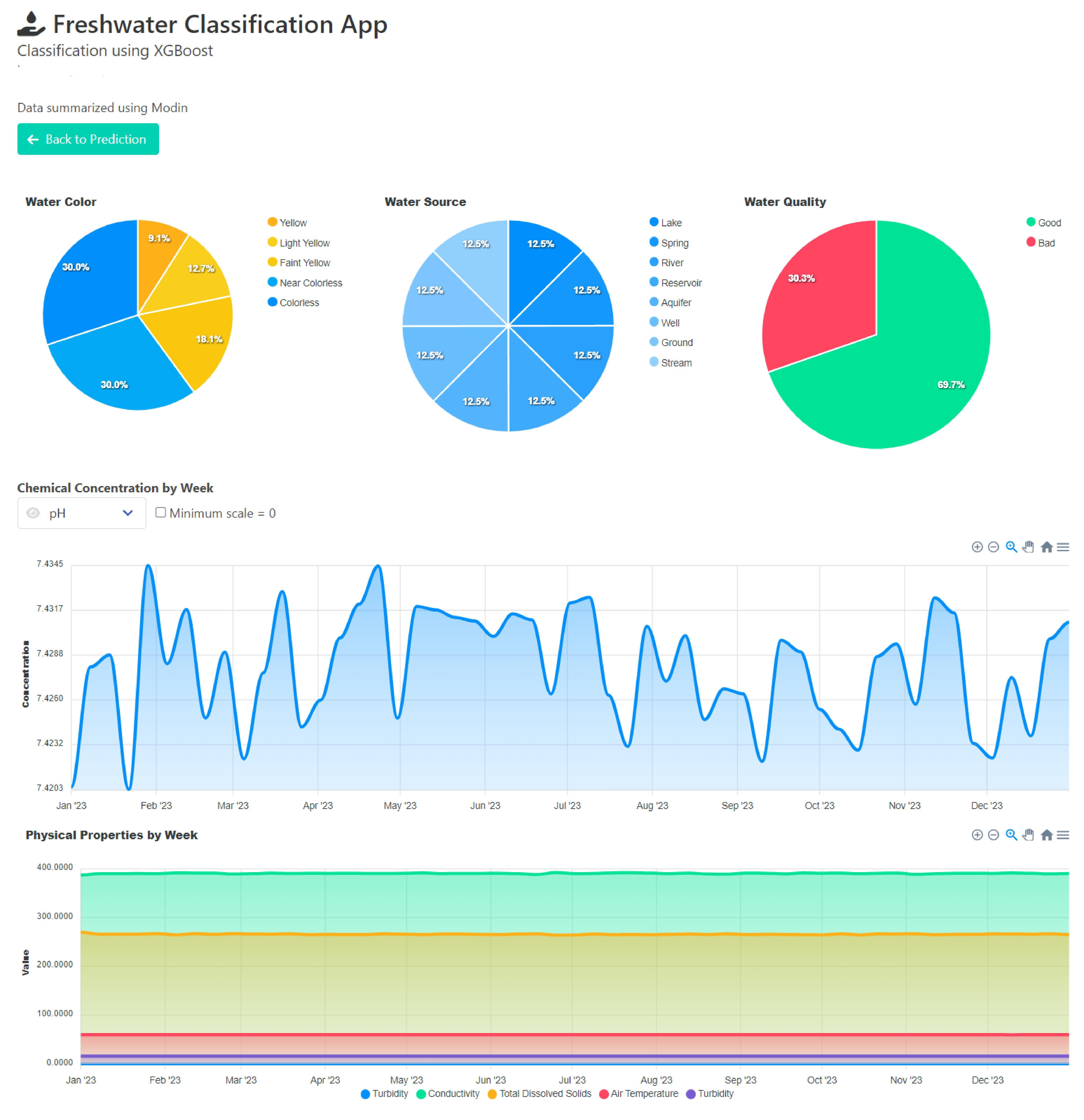 Здесь вы можете увидеть некоторые диаграммы, такие как цвет воды, источник и процент качества, а также диаграмму временных рядов химических и физических свойств воды. Вы можете выбрать, какое химическое вещество отображать, используя раскрывающийся список, и вы можете установить масштаб оси Y от автоматического до 0, используя флажок.